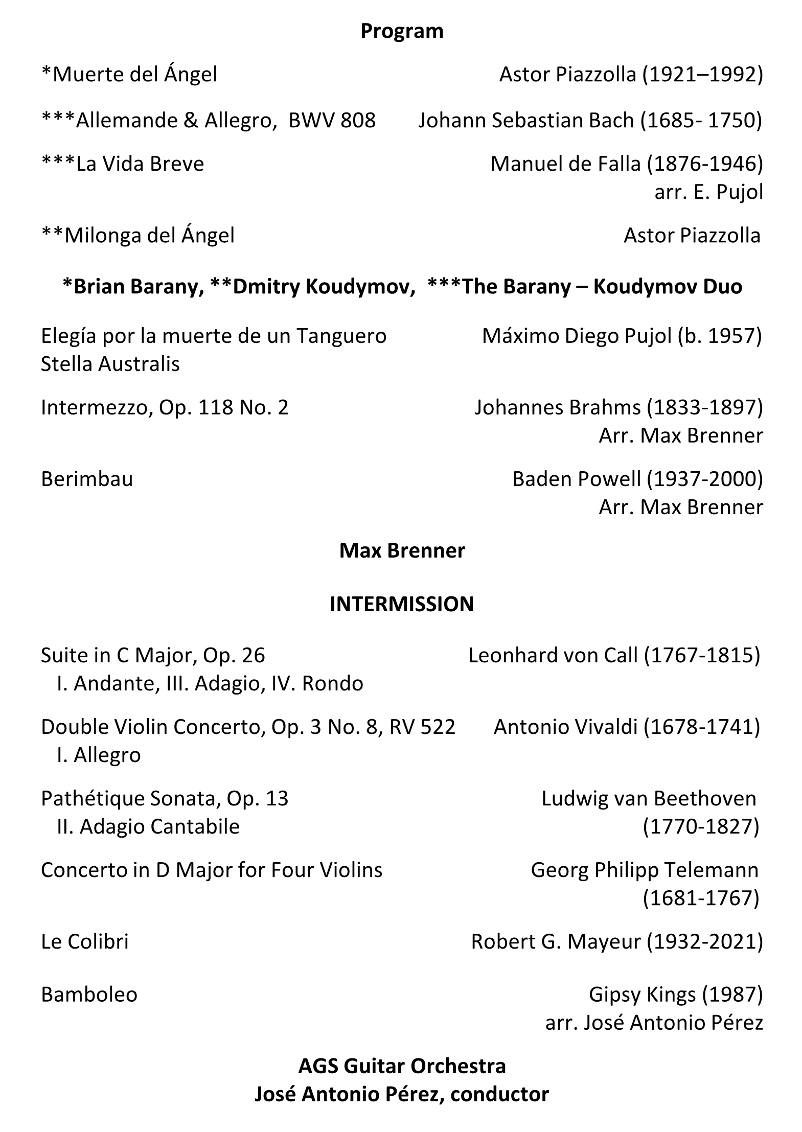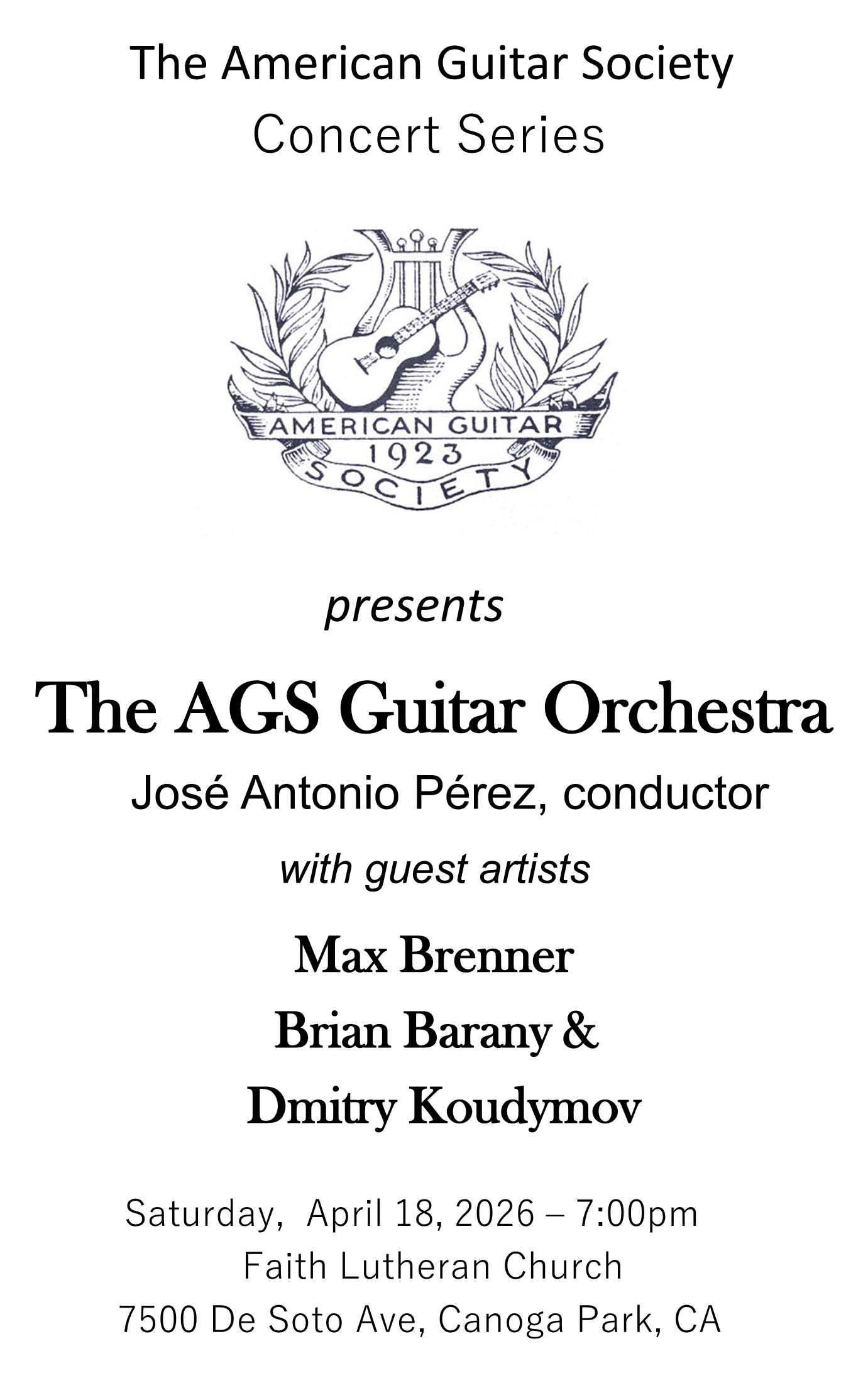 The 2026 AGS Guitar Orchestra featuring José Antonio “Pepe” Pérez, conductor, and special guest artists Max Brenner, and Brian Barany & Dmitry Koudymov. Concert begins at 7:00 pm in the Faith Lutheran Church, 7500 DeSoto Ave, Canoga Park.
